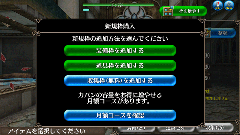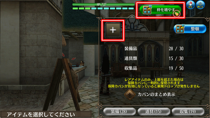 アイテム > 右上部「枠を増やす」> 収集枠を追加する]より収集枠の追加が行えます。