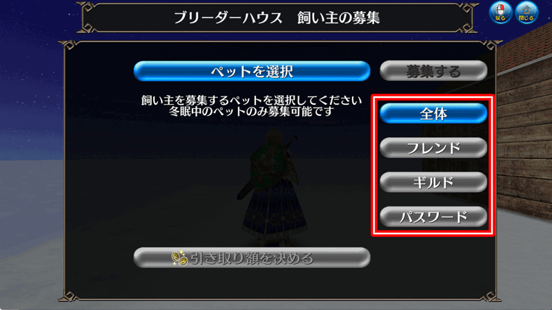 | ギルド | 同じギルドに所属しているメンバーを対象に飼い主を募集します。 |